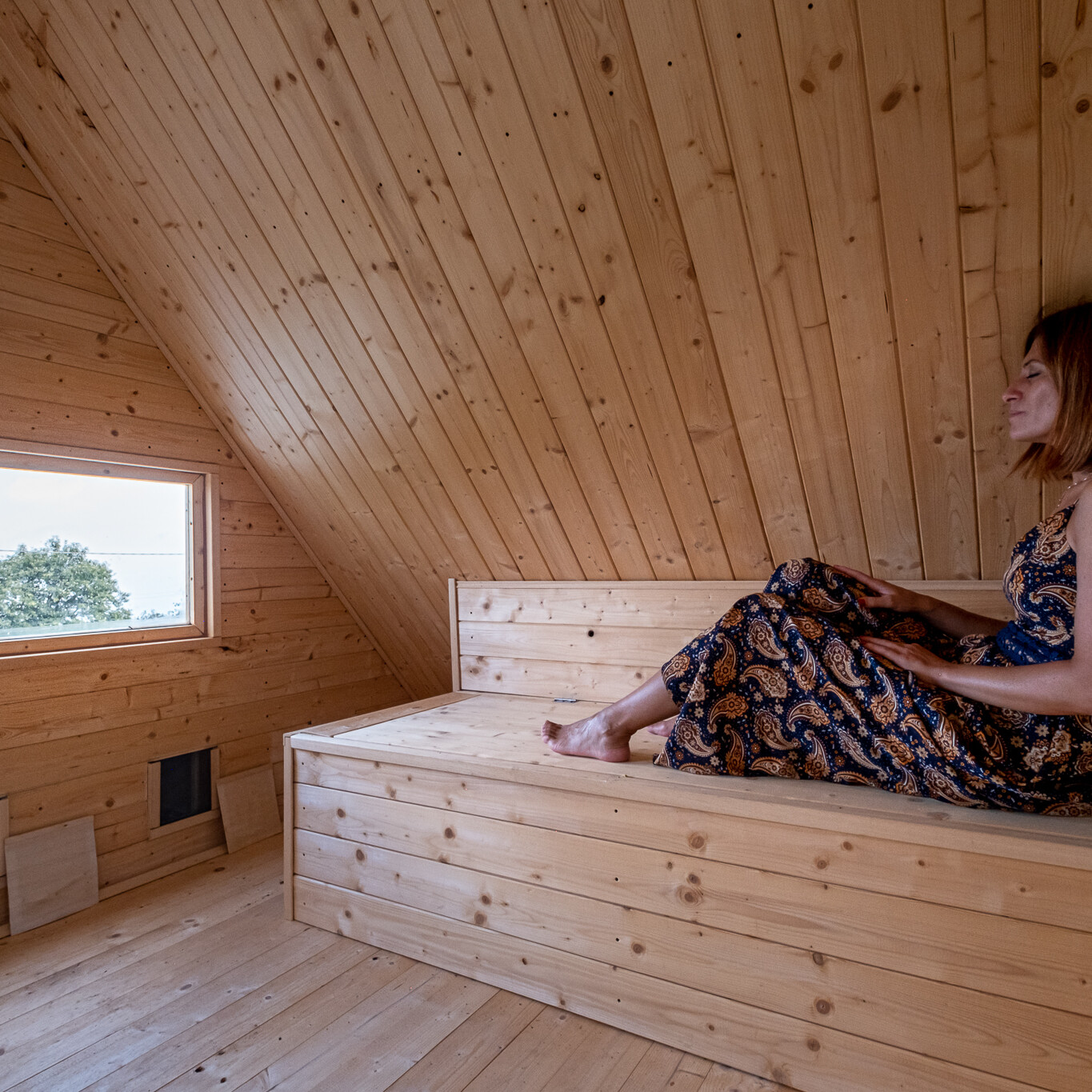 In questo luogo intimo e raccolto, l’odore del legno naturale si fonde con gli aromi degli alveari. Il ronzio delle api permette alla mente di distendersi alle frequenze dei suoni della Natura, mentre la vista si delizia con i paesaggi circostanti attraverso le ampie vetrate.